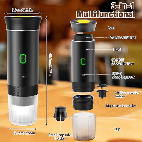 ☕【3-in-1 Vielseitige】Diese mobile kaffeemaschine ist sowohl mit einem Mahlkaffeefach als auch mit einem Kapselfach ausgestattet, wodurch sie mit verschiedenen Größen von Kapseln und gemahlenem Kaffee kompatibel ist. Es ermöglicht Ihnen, jederzeit und überall Kaffee zu genießen, die Ihren Vorlieben entsprechen.
